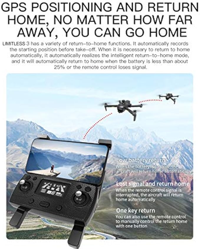 • GPS with AUTO RETURN HOME: LIMITLESS 4 has a Precise GPS System on-board which allows you to TRACK & RECORD your flight! A Map shows Distance & Speed of the drone as well as its exact Latitude & Longitudinal location all on your screen! RETURN TO HOME (RTH) works seamlessly with 1 press of a button your drone comes back to its exact take-off location. NEVER WORRY about Low Battery or Loss of Signal-- LIMITLESS automatically RETURNS HOME keeping your quadcopter safe from harm!