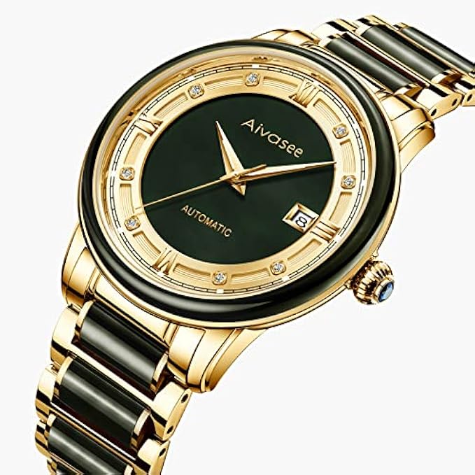 Aivasee Automatic Wrist Watches for Men Black Jade Dial Watches with Stainless Steel Band, Jewelry Luxury Rhinestones Dress Watch with Date Window (Model: AH6023B)