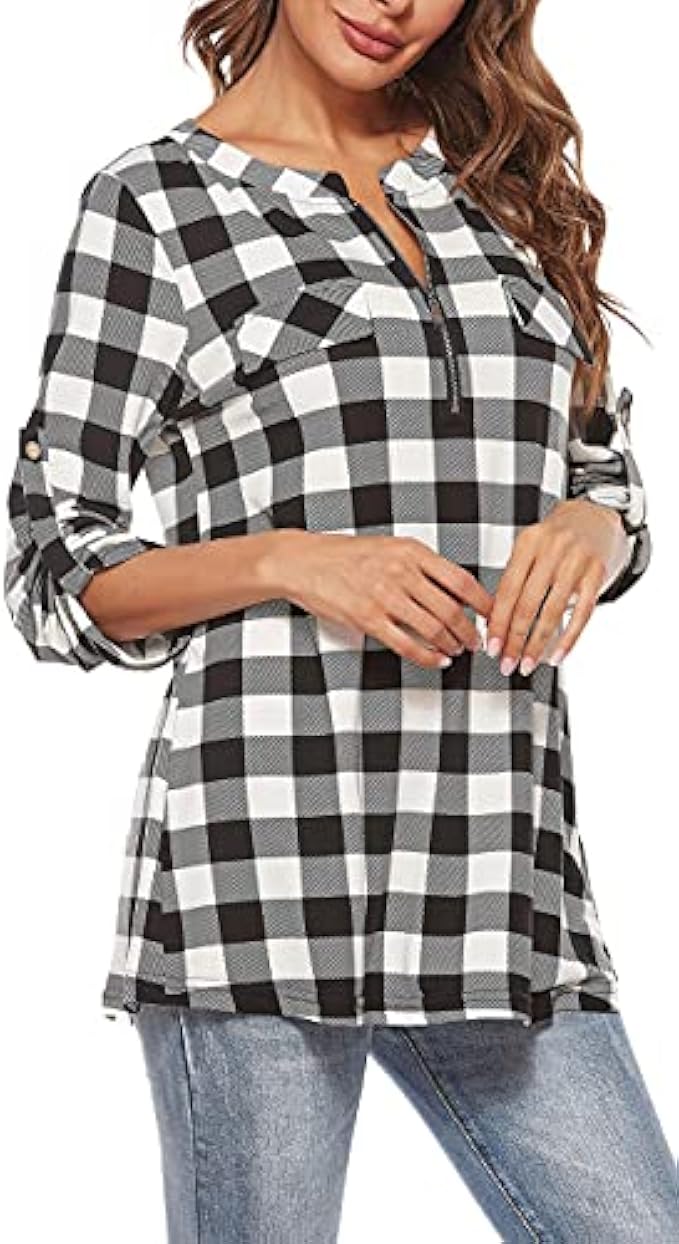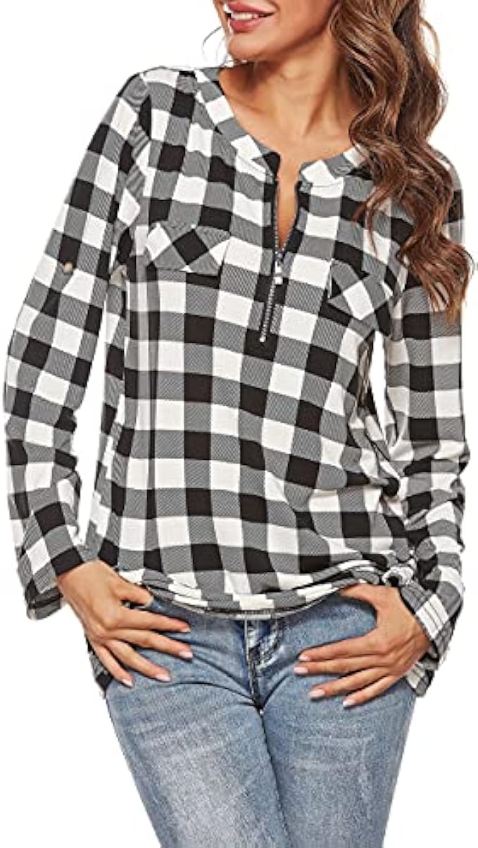 • [Zipper V-Neck]- Plaid casual shirts for women has a attractive zipper, you can easy to adjust it for comfort. These notched v-neck floral printed tops also have fake pocket flaps, please be well noted.