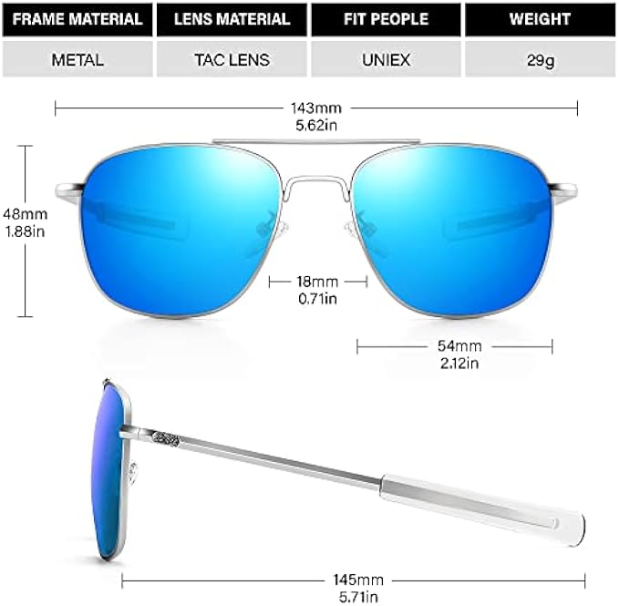 • ★MILITARY AVIATOR SUNGLASSES★- The hottest trends are coming your way this summer. With its unique double bridge design, the aviator glasses have a super fashionable appearance, a classic metal frame, a dazzling metallic luster appearance, and TAC polarized lenses to provide you with UV400 professional-level sun protection.
