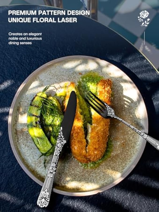 • Unique Laser Engraving: Beautiful flower pattern laser engraving on each handle of the fork and knife set, coupled with highly textured tones and classic shapes, gives it a unique, stylish look, eye-catching design and superior quality, making it stand out from ordinary silverware, creating a sense of elegance, nobility and luxury for dining.