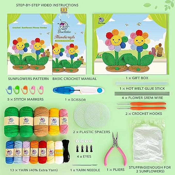 • All-In-One Crochet Starter Kit: CROCHETTA beginner crochet kit includes everything you need to start: 13 different colored yarns, ample stuffing, 1 yarn needle, 4 eyes, 5 stitch markers, 2 plastic spacers, 2 ergonomic crochet hooks, 1 pair of scissors, 1 hot melt glue stick, 4 flower srem wire, 1 crochet sunflower pattern, and a beginner's basic crochet manual.