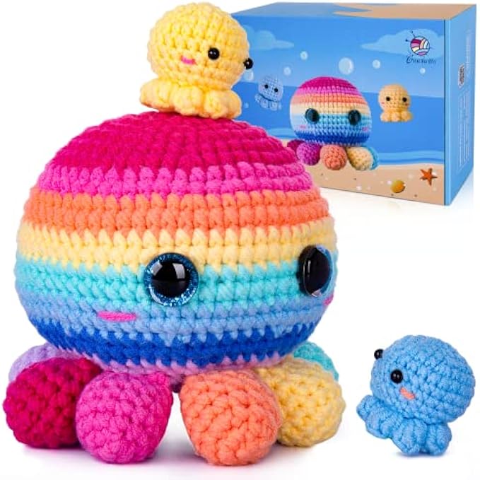 • All-In-One Crochet Starter Kit: CROCHETTA beginner crochet kit includes everything you need to start: 8 different colored yarns, ample stuffing, 2 yarn needles, 6 eyes, 5 stitch markers, 2 ergonomic crochet hooks, 1 pair of scissors, 1 crochet octopus pattern, and a beginner's basic crochet manual.