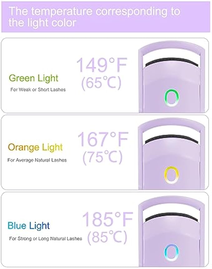 • Adjustable Temperature - heated lash curler has 3 temperature control options: low-temperature 65°C/149°F (green light) - for fine and soft lashes, medium temperature 75°/167°F (orange light) - for natural eyelashes, high temperature 85 ℃/185°F (blue light) - for hard, thick lashes. Click to toggle the button to match women with various eyelash types and styles. Plus, the heated silicone pads of the eyelash curler ensure even heat distribution for optimal curling results.