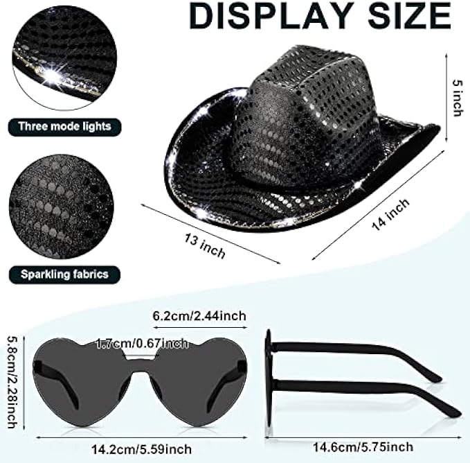 • Ample Quantity: the glitter cowboy hat set includes 6 pieces black light up cowboy hats, 6 pieces love shaped glasses, sufficient quantity to share with your friends, also as costume accessories for Halloween parties, concert party
