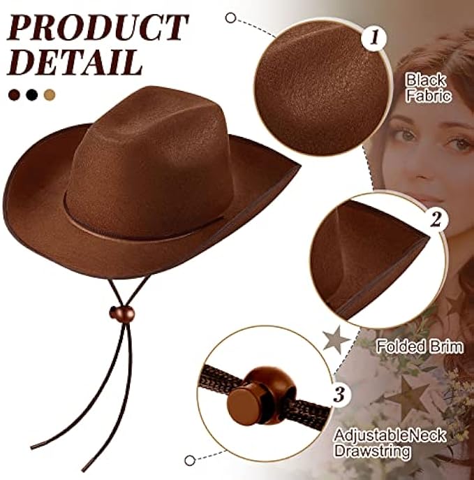 • Classic Design: this brown cowgirl party hat features an adjustable drawstring that can be removed as needed and it need to self-assembled; The classic brown cowgirl hat will never goes out of style, you can doodle on it and style the hat the way you want; The hat features a turned-up style brim, great for decorating, dressing up, or ride off into the sunset