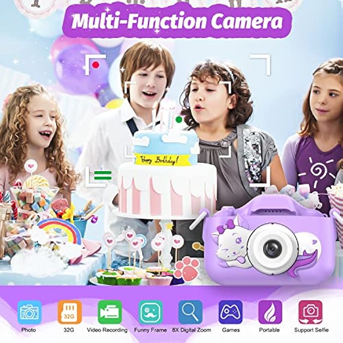 • 【Funny Multifunctional Camera】The camera 8.0 Mega pixels and 1080P Video, Greatly improved the definition of photos. there are 27 funny frames and 4 magic filters, supports burst shooting, 3 kinds of time-lapse, equipped with 4x digital zoom. Age 3-7 girls boys can choose their favorite scene or photo frame according different ideas and inspire children's imagination and creativity to realize the dream of a small photographer. Let them own a happy time.