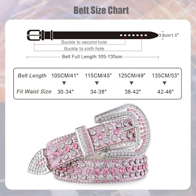 • Multiple Size & Colors Choice:Belt width: 1.5".Sizes range from Small To X-Large four sizes.Please refer to our size chart to choose the shiny rhinestone belt that fits your pants size.S size:for waist 30"-34"; M size:for waist 34"-38"; L size:for waist 38"-42"; XL size:for waist 42"-46". There are 7 holes to help adjust the right size.