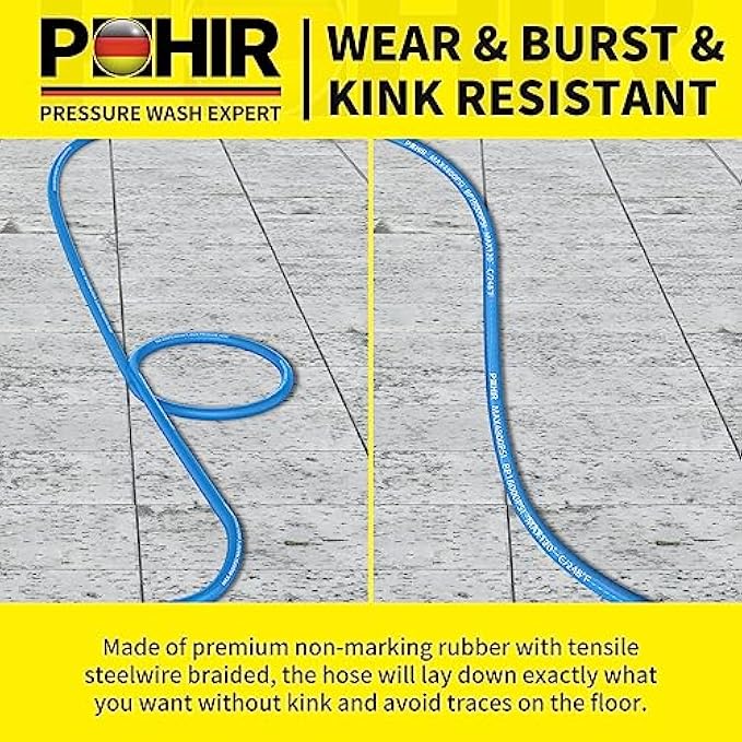 • 3/8 Quick Connect & Warranty - Ends of the power hose have solid & high quality 3/8" QC fittings. It’s not only easy to connect & disconnect but also helps hook up firmly. Designed to be compatible with most brands of pressure washing machines. If you have any issues, please feel free to message POHIR at any time, we're online 7x24 ready for warranty & support.