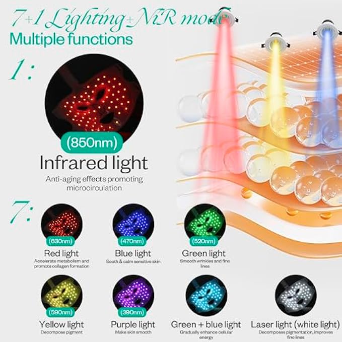 • +7 Wavelengths Led Face Mask Suitable for All Skin Types: The Contour Face of Red Light Therapy is specially designed for the face. The different wavelengths of lights help to resolve corresponding bothersome skin problems. It is suitable for all skin types. Choose the corresponding light according to the needs of the skin and perform facial care to create fair, healthy, elastic and youthful skin!