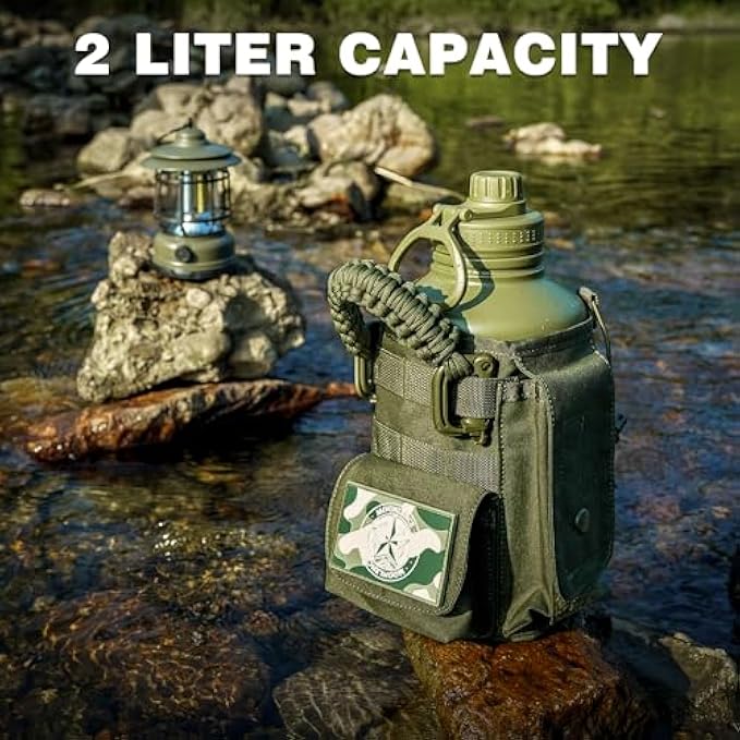 • 【64 Oz Large Capacity Design】The wide-mouth design of this military-style insulated water bottle easily accommodates ice cubes and simplifies cleaning. Whether you're engaged in fitness workouts, hiking, camping in the wilderness, embarking on hunting expeditions, work, or outdoor training, this 64 Oz (half-gallon) generous capacity caters to your hydration needs. No more frequent refills, allowing you to focus on savoring every adventurous moment.