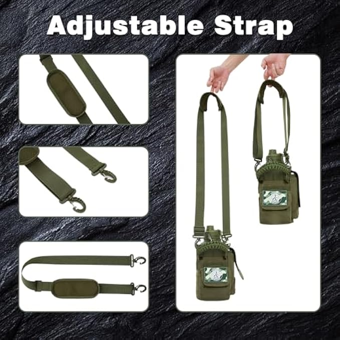 • 【Multi-Functional Protective Sleeve and Storage Pouch】 The detachable nylon sleeve safeguards the water bottle against scratches and impacts. Additionally, the sleeve features two storage pockets for items like smartphones, keys, cards, and other small essentials. The sports water bottle also comes with a nylon detachable strap and a sturdy paracord handle, making it convenient to hang on your shoulder or attach to your backpack during outdoor activities.