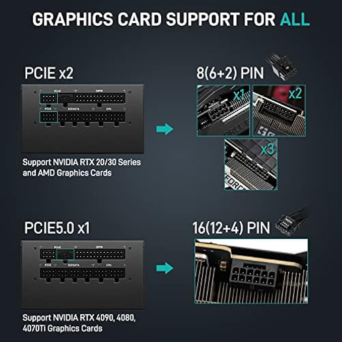 • 〖Graphics Cards Support for All〗It comes with 2x PCIE 4.0 ports support NVIDIA RTX 20/30 Series and AMD graphics cards, 1x PCIE 5.0 port support NVIDIA 4090/4080/4070Ti graphics cards.